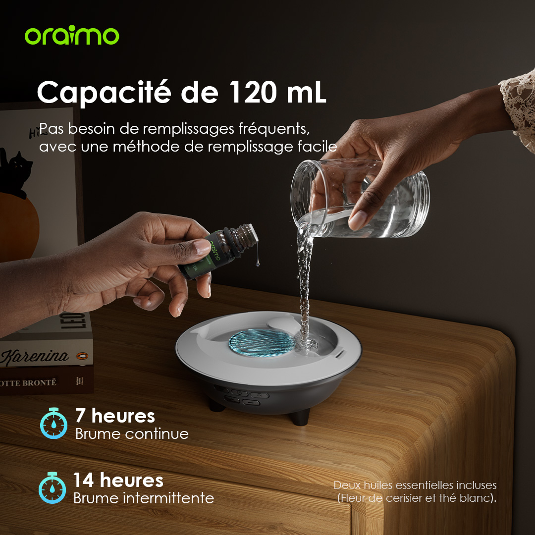 La capacité de 120 mL permet une utilisation prolongée sans avoir besoin de remplissages fréquents, offrant une diffusion continue de l’arôme et une humidification idéale, tandis que le design à remplissage facile assure un entretien rapide et simple