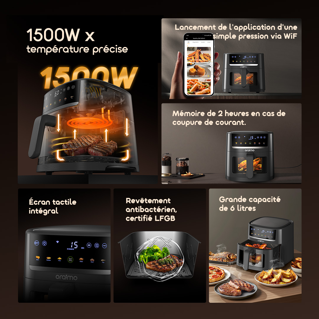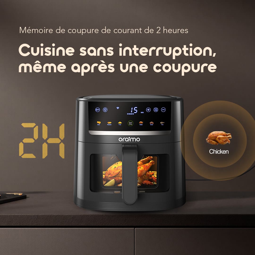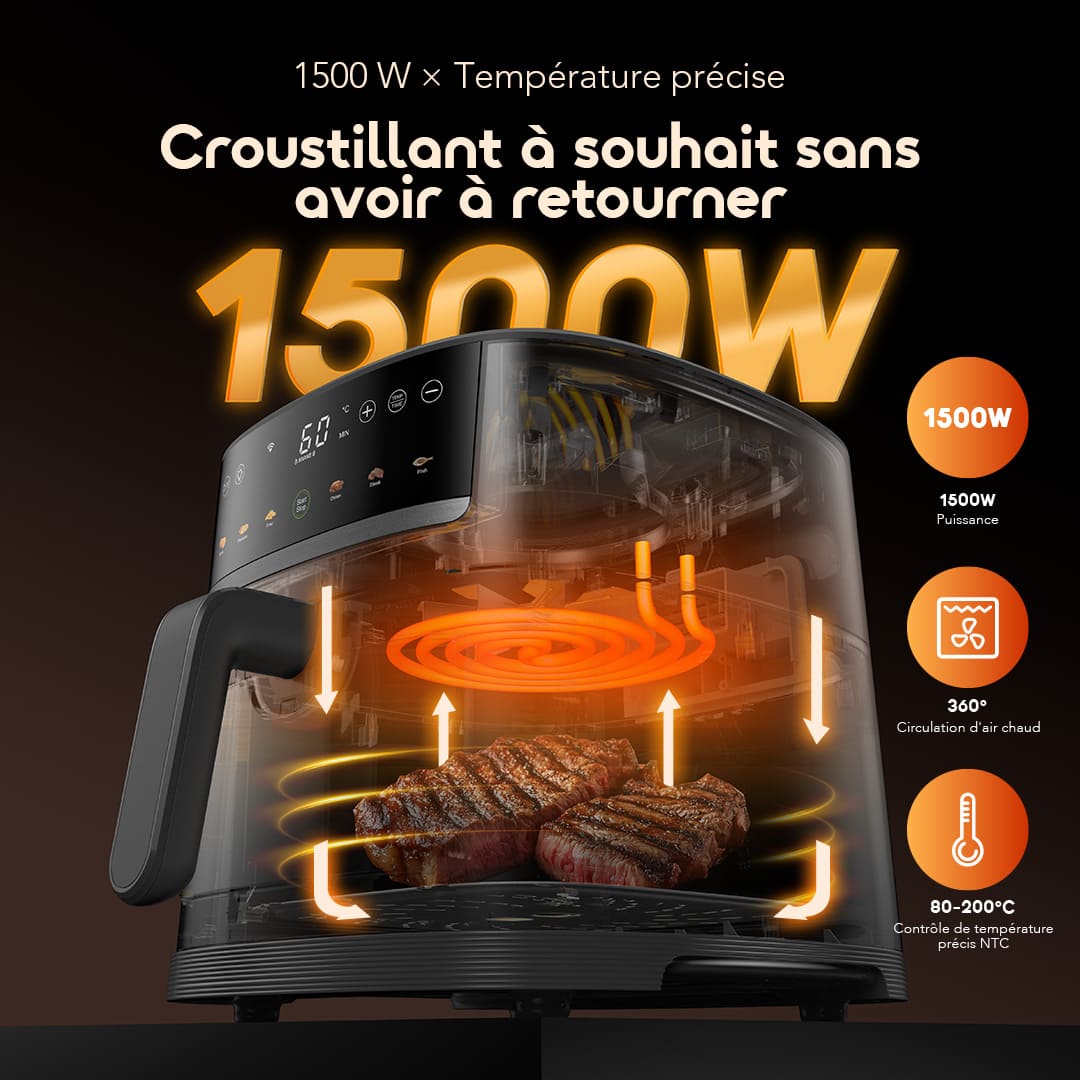 Contrôle précis de 80 à 200°C combiné à une circulation d’air chaud à 360° améliorée — flux d’air 29,4% plus puissant, couverture 114% plus large. Cuisson uniforme sans retournement. Parfait pour frites, poulet, fruits de mer, etc.