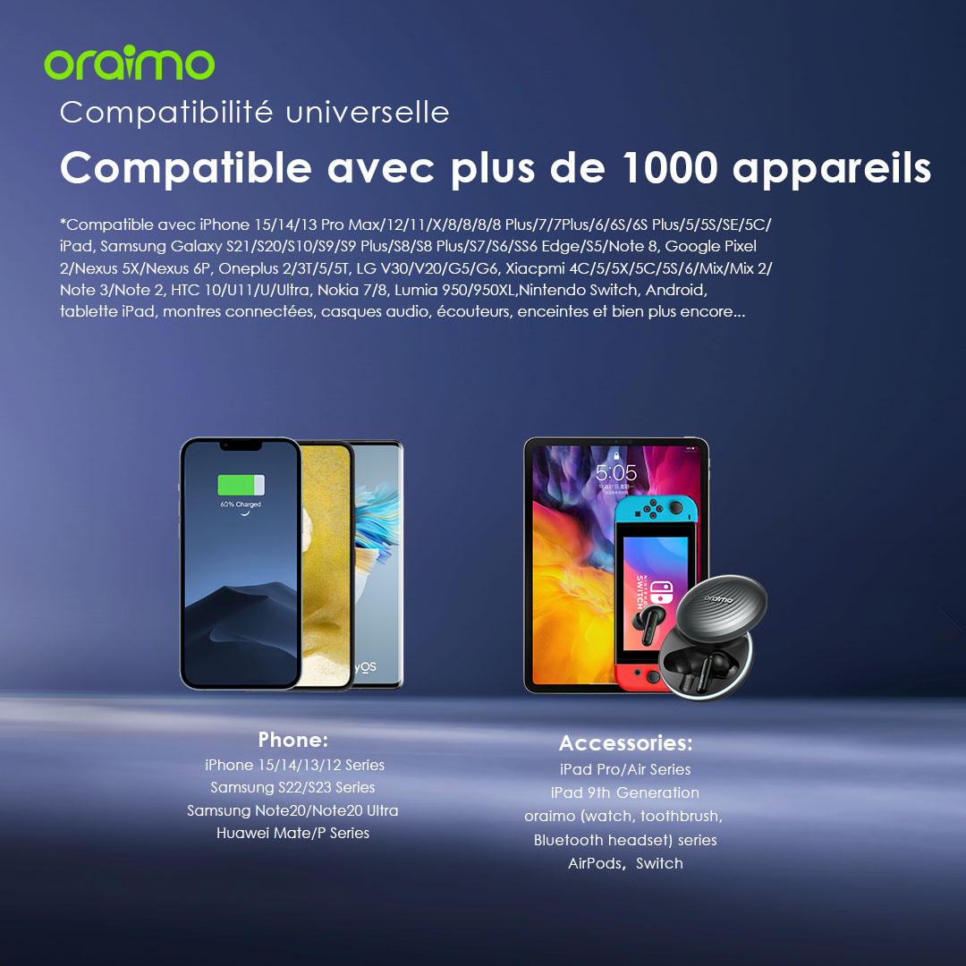 *Compatible avec iPhone 15/14/13 Pro Max/12/11/X/8/8 Plus/7/7 Plus/6/6S/6S Plus/5/5S/SE/5C/iPad, Samsung Galaxy S21/S20/S10/S9/S9 Plus/S8/S8 Plus/S7/S6/S6 Edge/S5/Note 8, Google Pixel 2/Nexus 5X/Nexus 6P, Oneplus 2/3T/5/5T, LG V30/V20/G5/G6, Xiaomi 4C/5/5X/5C/5S/6/Mix/Mix 2/Note 3/Note 2, HTC 10/U11/ U/Ultra, Nokia 7/8, Lumia 950/950XL, Nintendo Switch, Android, iPad Tablet, montres intelligentes, casques, écouteurs, enceintes et plus encore...