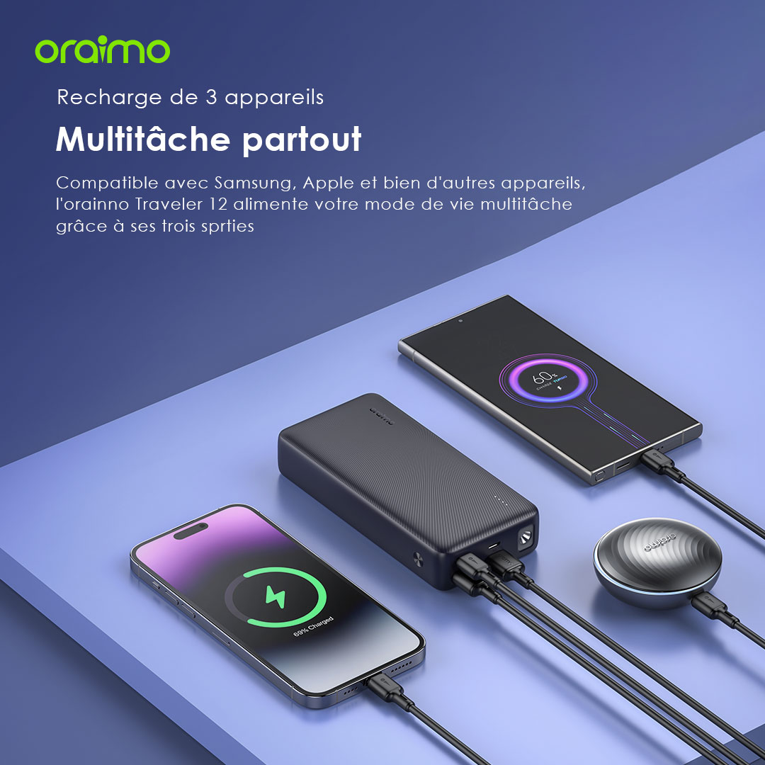Compatible avec Samsung et Apple et d'autres appareils, l'oraimo Traveler 12 alimente votre mode de vie multitâche avec trois sorties.