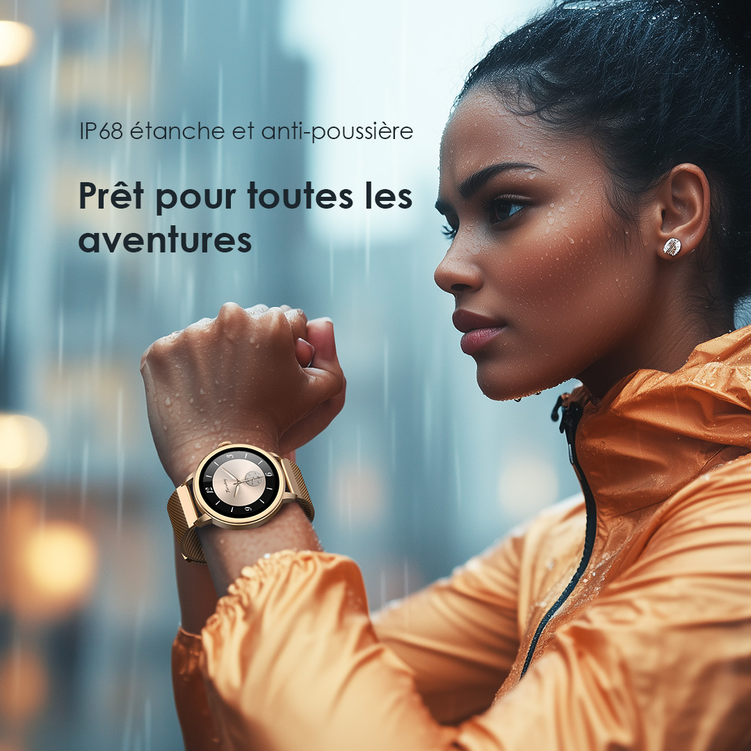 Dotée d'une protection IP68, Watch Muse continue de fonctionner à travers les éclaboussures, la pluie ou les conditions poussiéreuses, vous permettant d'affronter chaque jour en toute confiance.