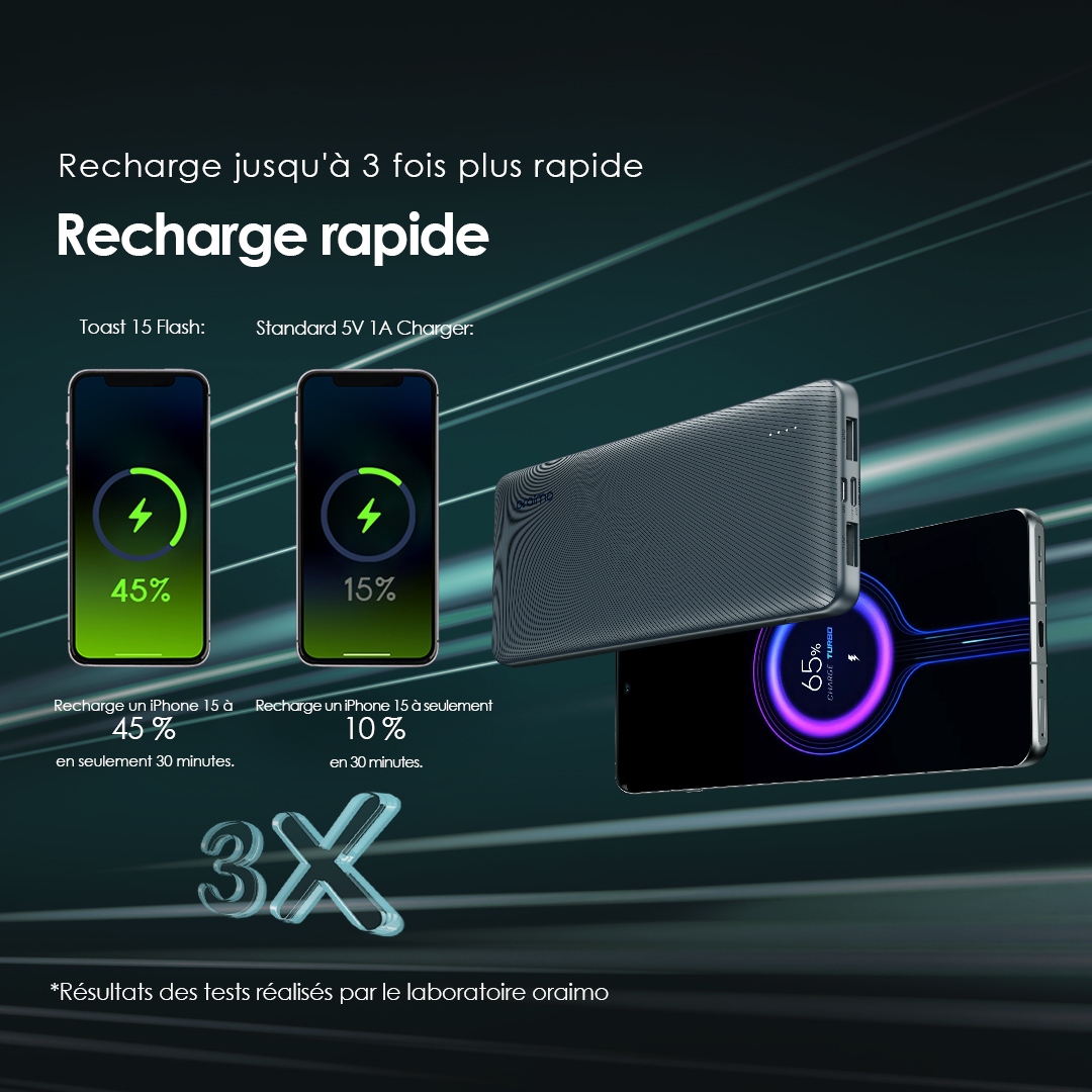 Toast 15 Flash : recharge un iPhone 15 jusqu’à 45% en seulement 30 minutes. Chargeur standard 5V 1A : seulement 10% en 30 minutes. *Basé sur les résultats des tests du laboratoire oraimo